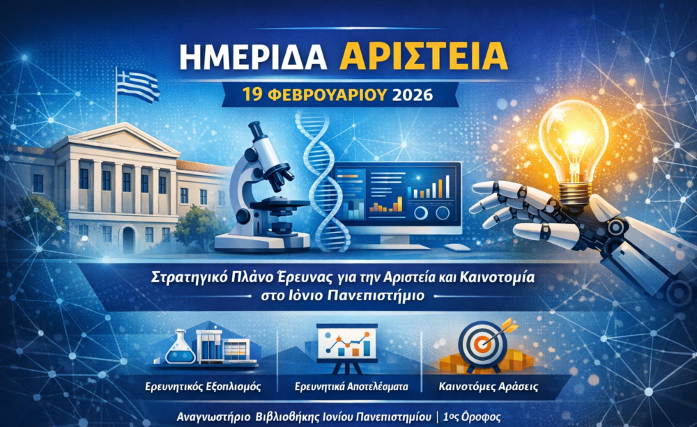 Το Ιόνιο Πανεπιστήμιο διοργανώνει την Πέμπτη 19 Φεβρουαρίου 2026 και ώρα 10.30 – 15.00 απολογιστική ημερίδα στο πλαίσιο του έργου «Στρατηγικό Πλάνο Έρευνας για την Ενίσχυση και Ανάπτυξη της Αριστείας και Καινοτομίας στο Ιόνιο Πανεπιστήμιο», το οποίο υλοποιείται μέσω της δράσης SUB.2 «Πανεπιστήμια Αριστείας» και χρηματοδοτείται από το Ταμείο Ανάκαμψης και Ανθεκτικότητας «Ελλάδα 2.0». Η εκδήλωση θα πραγματοποιηθεί με υβριδικό τρόπο στο Κτήριο της Βιβλιοθήκης (Ιωάννου Θεοτόκη 72, Κέρκυρα), με δυνατότητα διαδικτυακής παρακολούθησης στη διεύθυνση: https://youtube.com/live/RkwyKUDkWec? feature=share